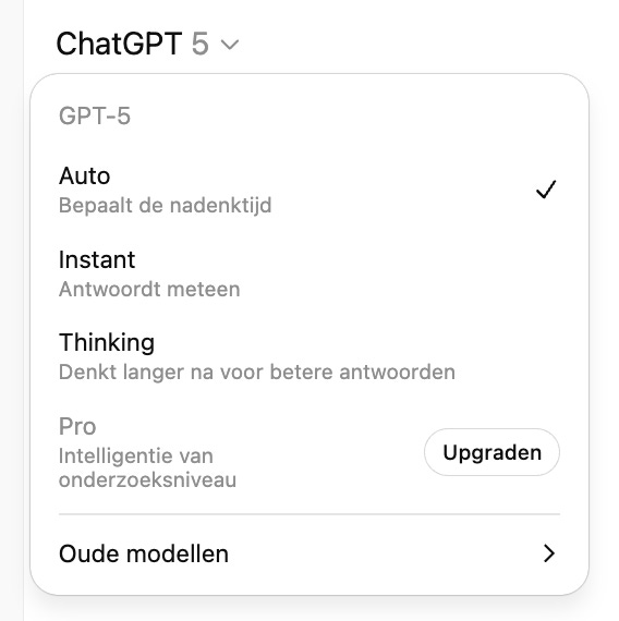 En dan heb je nog de Auto-variant: de automatische assistent. Die kiest zelf de denkmodus, maar blijft te vaak hangen in ‘Instant’. Denk daarom altijd zelf na over je denkmodus en blijf kritisch op de antwoorden.
