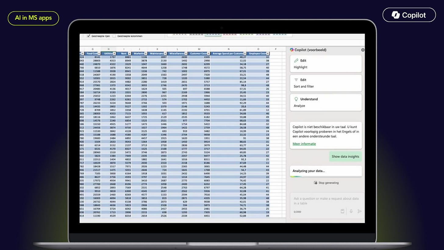 Nadelen: Het werkt nog niet altijd lekker en je moet hiervoor (nog) de extra Copilot 365 licentie aanschaffen. Gebruikers klagen ook vaak over errors en bij complexe data haakt het snel af.